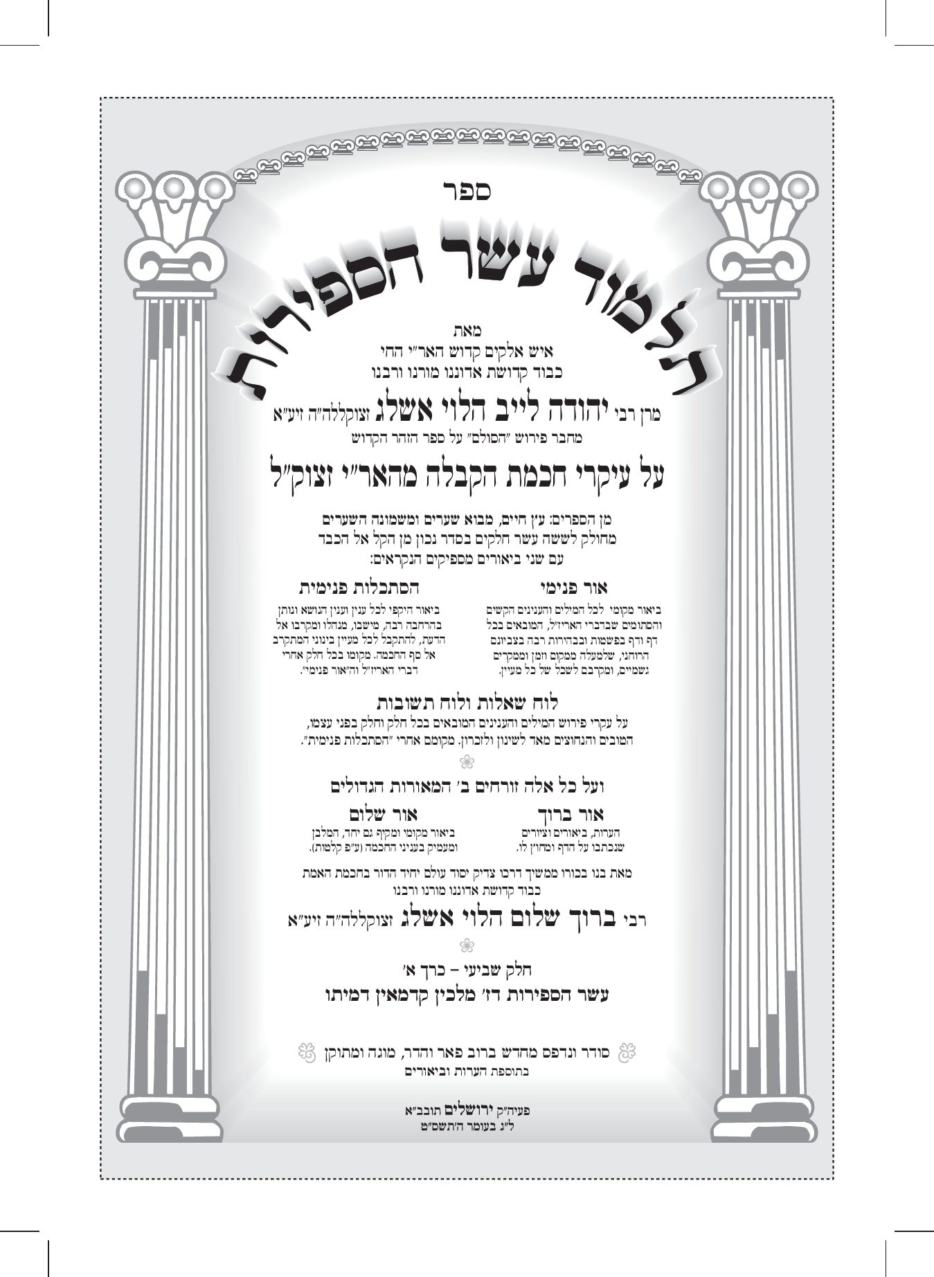 הכרך השישי מתוך תלמוד עשר הספירות חיבורו הענק של רבי יהודה אשלג – בעל הסולם זיע”א, המפרש את כתבי האר”י הקדוש בצורה בהירה ונפלאה מסודר בסדר סיבה ומסובב. ועליו נוספו ביאורי בנו של בעל הסולם רבי ברוך שלום אשלג זצ”ל, המרחיבים ומבארים את הסוגיות השונות.